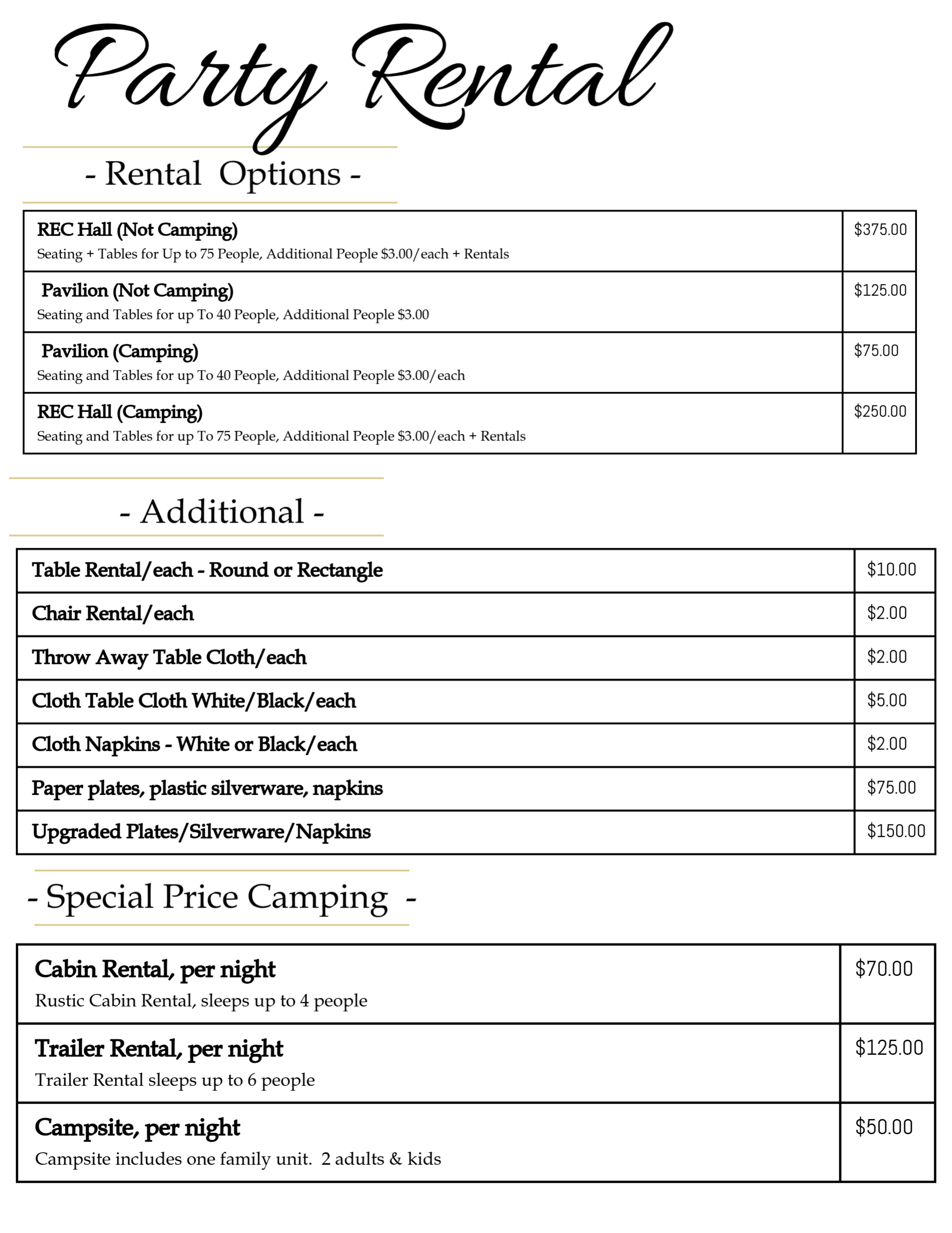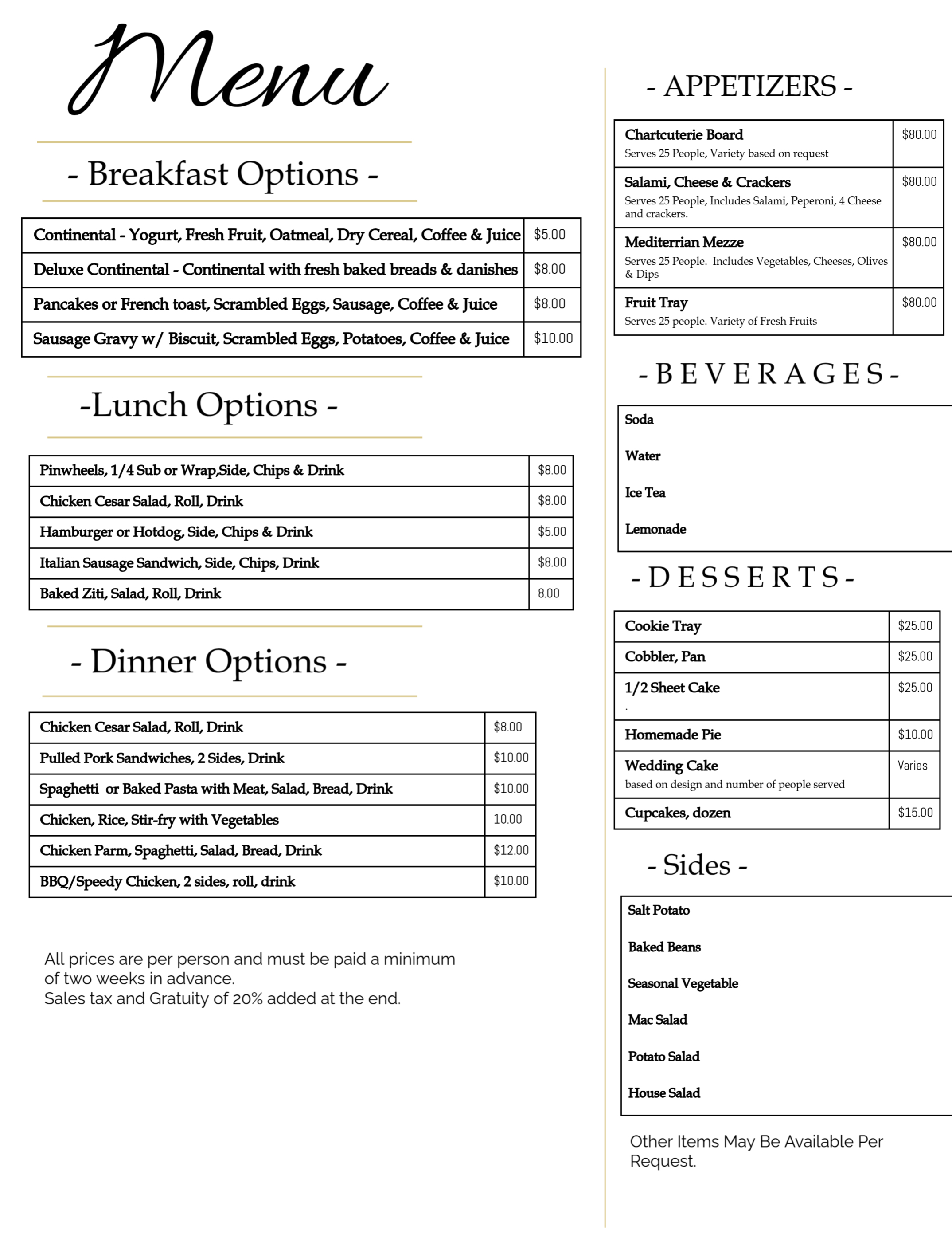 Forget the stress of finding an outside caterer. Camp Bell Campground offers incredible, budget-friendly on-site catering to keep your guests happy and full! (All prices are per person).